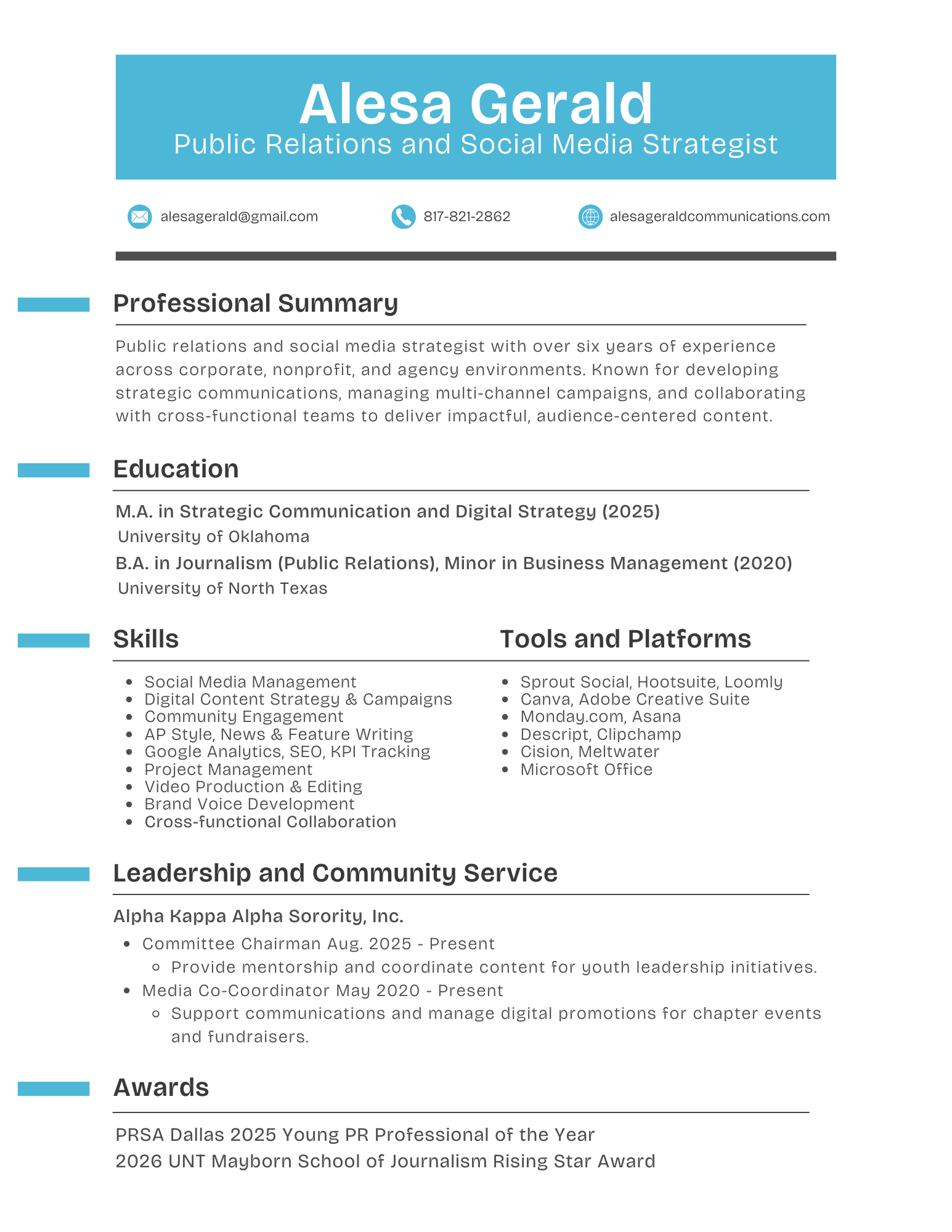 I am a creative and results-driven communications strategist with over six years of experience in public relations, content strategy, and social media management across corporate, health care, nonprofit, and start-up sectors. I have proven the ability to lead digital campaigns, grow engaged communities, and execute content strategies that align with brand voice and goals. As a communications professional dedicated to excellence, I am adept in platform management, visual storytelling, and stakeholder engagement.